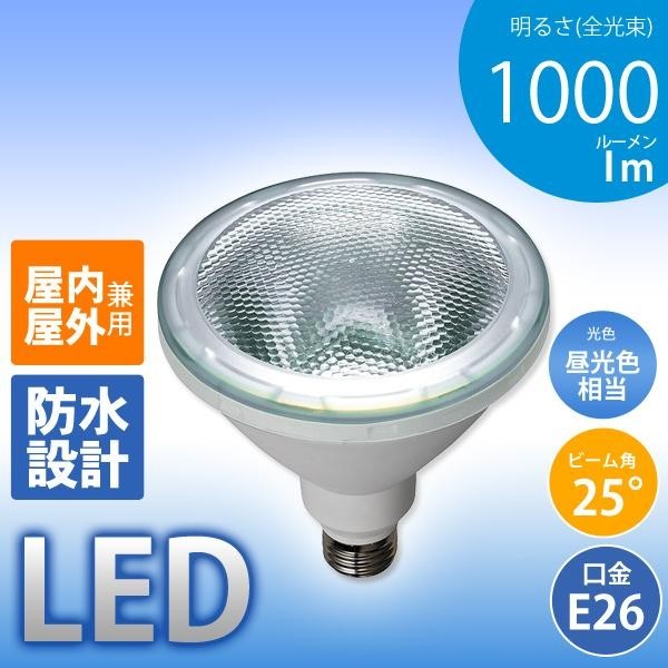 | 仕様 | 交流電源:100V 50/60Hz共用 口金サイズ:E26 定格消費電力(W):14.0 定格入力電流(A):0.24 設計寿命(h):約40000 全光束(lm):1000 光色:昼光色相当 ビーム光束(lm):220 ビーム角(度):25 中心光度(cd):2000 防水仕様:IP65 ※防水・防雨形のビームランプ専用器具使用時 |