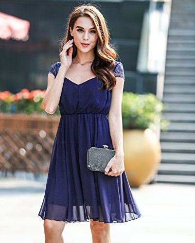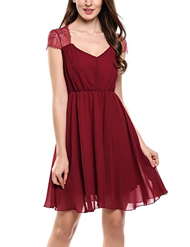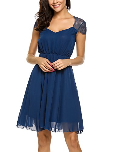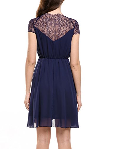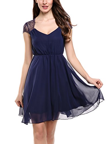 Features: A Line pleated style/Cap Sleeve/ V Neck/sheer floral lace patchwork /elastic high waist