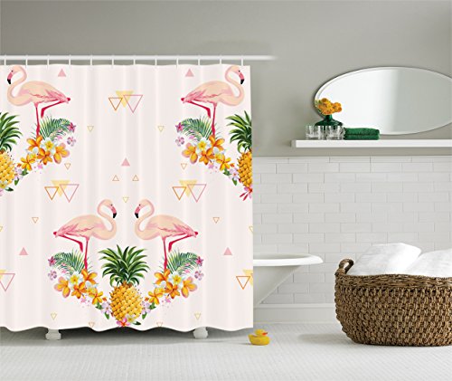 Ambesonne Flamingo Decor Collection, Geometric Pineapple Flamingo Tropical Summer Party Theme Artistic Design, Polyester Fabric Bathroom Shower Curtain, 84 Inches Extra Long, Crimson Green Mustard