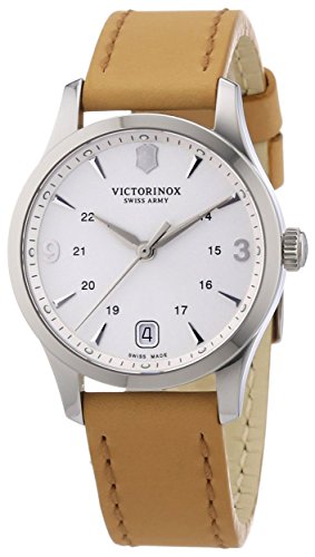 Stainless steel case with a beige leather strap. Fixed stainless steel bezel. Silver dial with silver-tone hands and index hour markers. Arabic numeral marks the 3 and 9 o'clock positions. 24 hour markers. Minute markers around the outer rim. Dial Type: Analog. Date display at the 6 o'clock position. Quartz movement. Scratch resistant sapphire crystal. Pull / push crown. Solid case back. Case diameter: 30 mm. Round case shape. Band width: 21 mm. Tang clasp. Water resistant at 30 meters / 100 feet. Functions: date, hour, minute, second. Casual watch style. Victorinox Swiss Army Alliance Silver Dial Beige Leather Ladies Watch 241541.Feature