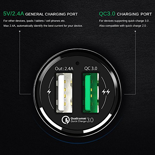 Optimal Charging: Qualcomm-certified car charger with Quick Charge 3.0 Port + AiPower Adaptive Charging port with dedicated 2.4A output