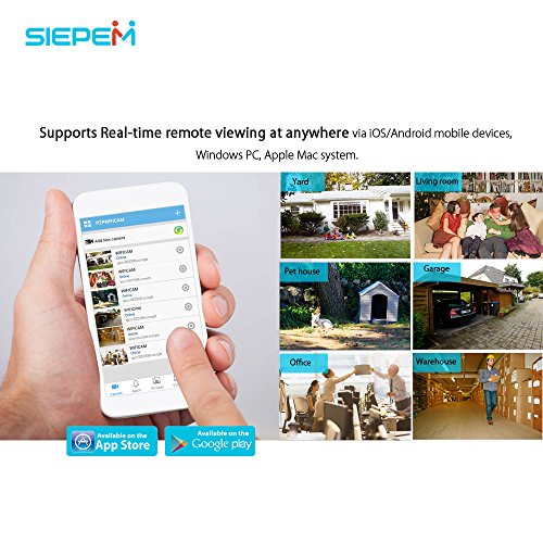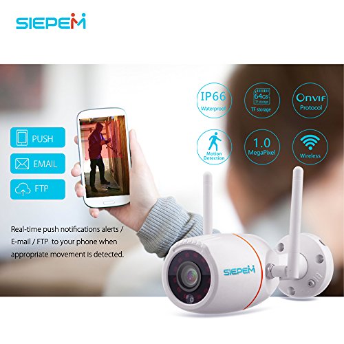 -. Feature : Easy to setup & with the free siepem App "P2PWIFICAM" on Android, iOS, and desktop browsers, you can easily setup and manage your outdoor security camera.This security ip camera helps you keep an eye the places, people, pets, and things you care about via your Smartphone,Tablet,Apple Mac or Windows PC) ,no matter where you are. / Full HD 1.0MP (1920 x 720) wide viewing angle(up to 80˚ ), 36pcs LEDs lights beads(Anti-dust) and 50ft night vision,Built-in IR-Cut device and capture more clearer and beautiful images & video in both day light and in night mode.It also has the advantage of low power at continuous operation will not hotter and video will not delays. / This wireless ip camera suitable for use in the outdoor and indoor environment, It's built with quality materials that look and feel red and durable,rated IP66 weatherproof for protection against weather effects. (Flexible mounting-lets you install on a wall or ceiling,it has the ability to easily adjust to the users preferred angle). / Real-time push notifications alerts / E-mail / FTP to your phone when approP.R.Iate movement is detected, you can customize your settings according to preferences. / SIMPEM security camera with CE & FCC certified and 1 year free warranty.