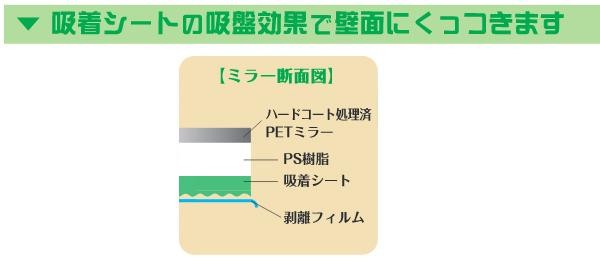 今までミラーを貼れなかった場所に吸着シートを利用してペタッと貼り付けることができる優れものミラーです。鏡の部分がPET樹脂でできており、ガラス鏡と違い、軽くて、落としても割れにくいのも特徴です。ハードコート処理を表面に施しておりますので、傷もつきにくくお子様のいるご家庭でも安心です。 |