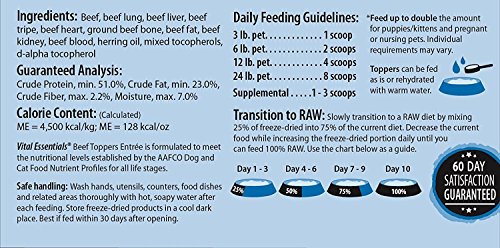 -. Feature : USA sourced, made, and packaged - Grain Free, Gluten Free, Guilt Free / Promotes digestive health, oral health, and optimum weight, thick glossy coats, firm muscles, and strong bones / No added hormones, antibiotics, fillers, flavorings, artificial preservatives, colors, or synthetic vitamins/minerals / Supports the ALPHA Prey-Model Diet / Vital Essentials Toppers Entrées are formulated to meet the nutritional levels established by the AAFCO Dog Food Nutrient Profiles for all life stages