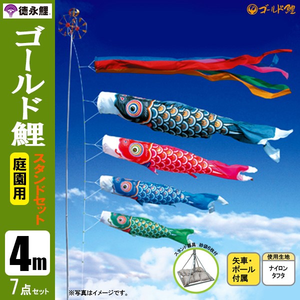 | ゴールド鯉 庭園用大型鯉のぼり スタンド砂袋式ポール付セット | 1.5m鯉3匹 | 2m鯉3匹 | 3m鯉3匹 3m鯉4匹 3m鯉5匹 | 4m鯉3匹 4m鯉4匹 4m鯉5匹 |