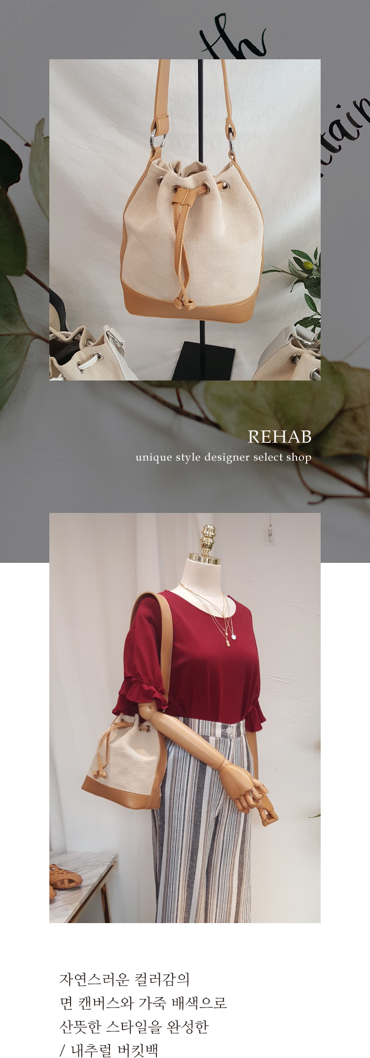 REHABナチュラルバケツバッグデーリールックに軽く持ちかけてもいいバケツバッグです。