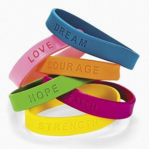 Inspirational Sayings Bracelets. These rubber bracelets have imprinted inspirational messages: COURAGE, DREAM, HOPE, LOVE, FAITH and STRENGTH. Wear one or several on your wrists! This jewelry makes a colorful party favor for goody bags at a church or Sunday School party. Kids love to collect these bracelets and share them with friends! Each piece bar coded. (2 dz./unit) 8" circ.Feature