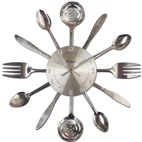 Studio : Ashton Sutton Publisher : Ashton Sutton Binding : Kitchen Product Description Features. Quartz Analog Wall Clock.. Utensil Style Case.. Brushed Silver finish.. Fork and Knife Shaped hands.. All silver case with special appeal for many rooms in the home.. Dimension - 15 x 1.5 x 15 in. 0
