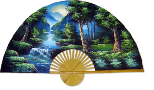 LARGE 60" FOLDING WALL FAN -- ASIAN FOREST -- ORIGINAL HAND-PAINTED WALL ART