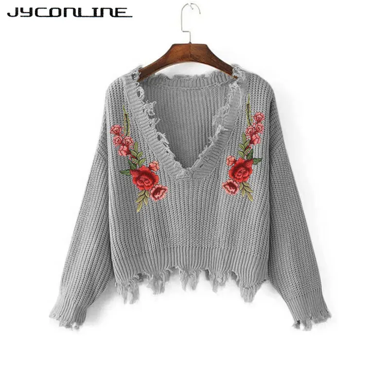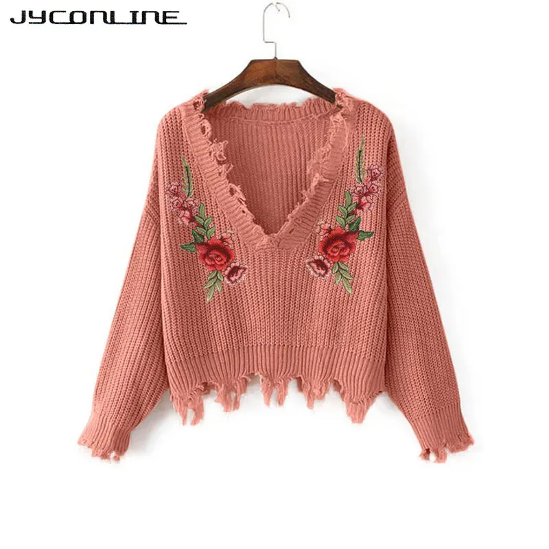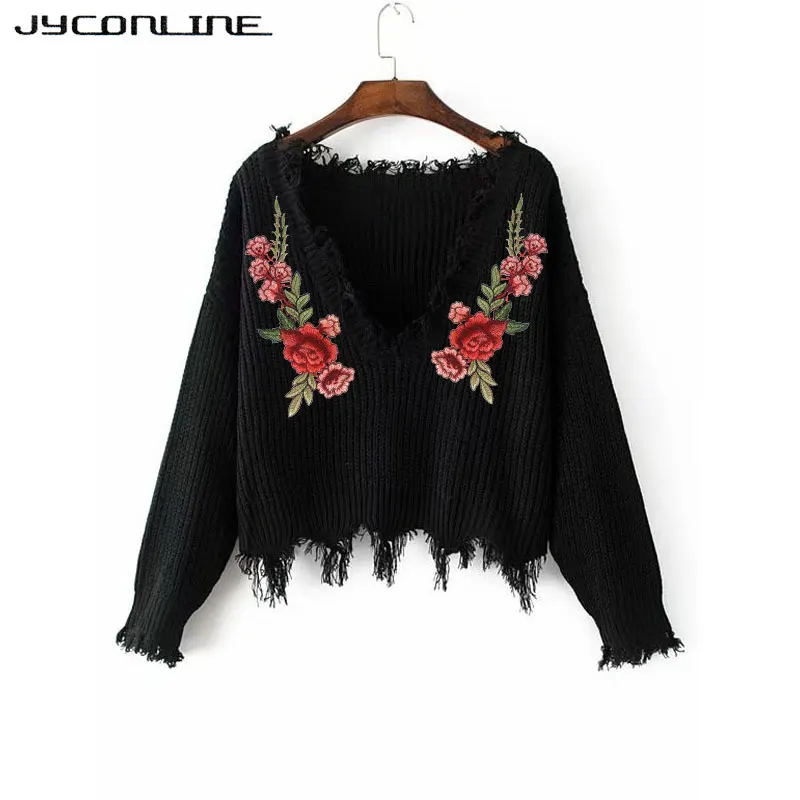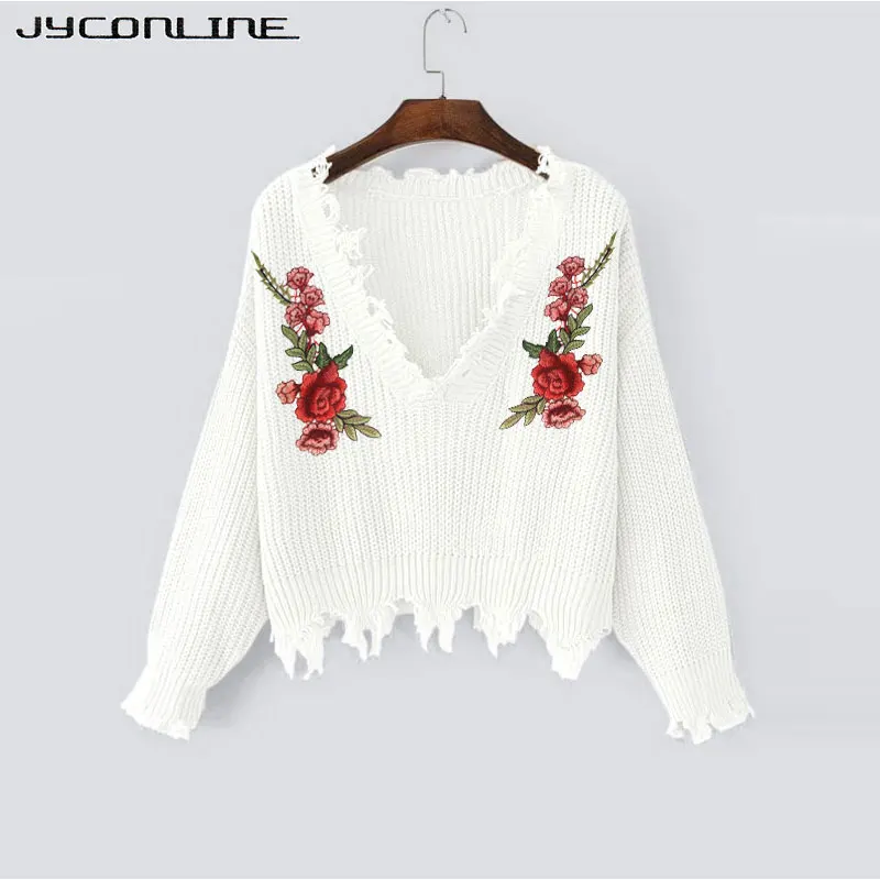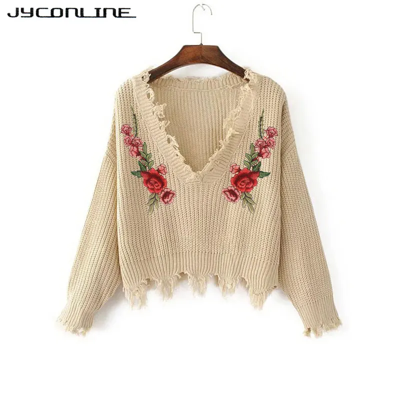 Women Sweater: Embroidery V-neck Sweater