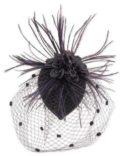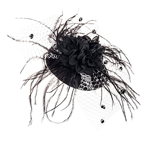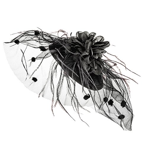 Black fascinator features 4" x 5¼" fabric cap with fabric flower, feather accents and mesh net. Includes clear comb. Brand : Zad Jewelry Item model num : HA4504BK MPN(PartNumber) : ZFA_HA4504BK_C9.00-CA Product Dimensions(LxWxH) : 13x18x3cm ; 9 g