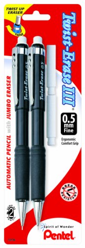 Pentel Twist-Erase III Automatic Pencil with 2 Eraser Refills, 0.5mm, Assorted Barrels, 2 Pack (QE515BP2-K6)