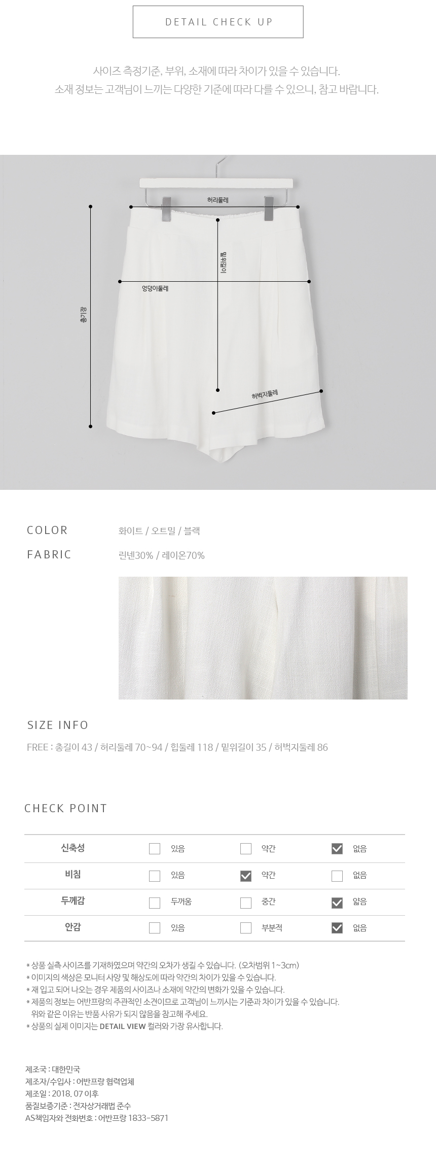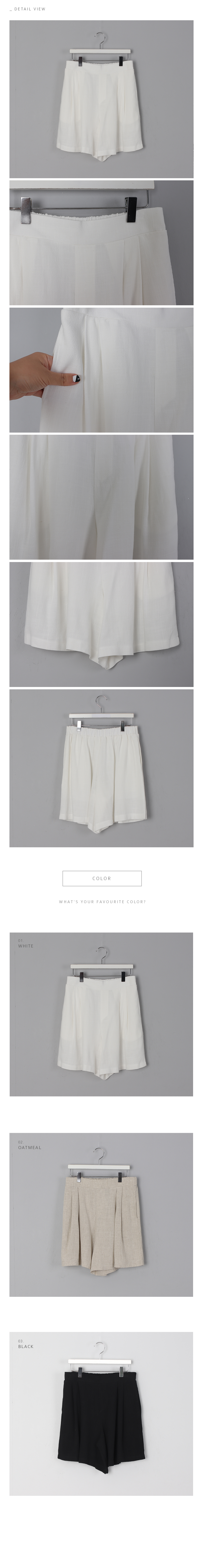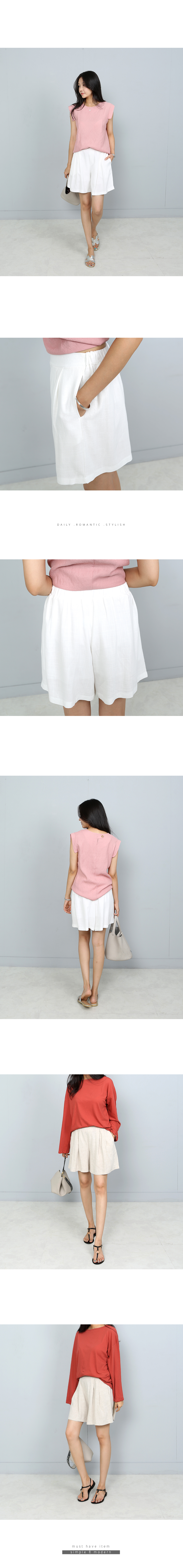 고급스러운 소재감의 4부 반바지 린넨 레이온 혼방으로 가볍고 실키하면서도 네추럴한 소재감이 고급스러운 4부 길이감의 반바지에요 입었을때 살짝 A라인의 핏으로 떨어지며 짧지 않은 길이감으로 단정하고 다양한 상의와 코디하기 좋은 핏의 반바지 랍니다 앞허리는 단정하게 오비 처리되어 버튼으로 클로징하고 뒷허리는 밴딩으로 편안하게 입기 좋답니다 색상은 화이트, 오트밀, 블랙사이즈는 44~66반까지 추천해요 ***소재 특성상 찬물세탁해주세요, 건조기 안돼요~~!▼ 관련상품 : 로즈 프릴 롱 블라우스 초코 여리핏 루즈티