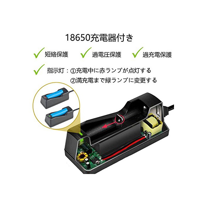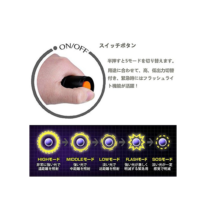 5종류의 점등 패턴을 바꾸는 것이 생깁니다. (HIGH,MID,LOW,점멸,SOS패턴 점멸) 부속품: 회중전등*1,18650배터리*1(2200Mah)고, 자전거용 홀더*1,★충전기*1(방열성이 있고, 스쳐 충전 보호 기능 첨부 와)★고, 단4배터리 홀더*1,전지 플라스틱관*1,수납 케이스
