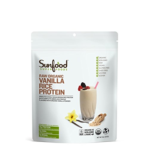 Raw Organic Rice Protein Powder, Vanilla - A delicious alternative to whey, soy and hemp protein powders, our whole grain brown rice protein powder contains 18 grams of protein per serving, plus a complete amino acid profile including all 9 essential amino acids. This makes it ideal for building lean muscle, burning fat, and boosting athletic performance. Derived from all layers of the rice grain and sprouted for easy digestion, our protein powder has a silky smooth texture that blends easily. Naturally flavored with organic lucuma powder and vanilla powder, it has an amazing vanilla twist you're sure to love! The Sunfood Difference - Our raw and non-GMO vanilla protein powder was crafted by the Sunfood team to combine superior ingredients into a great tasting, lightly textured blend that won't feel heavy in your stomach. It is free of chemicals, fillers, thickeners, binders, solvents, preservatives or any artificial flavors or colors, and has been independently tested for safe levels of heavy metals. This protein powder is hypoallergenic, perfect for people sensitive to dairy, gluten, or soy, or for any health enthusiasts looking for a deliciously smooth raw protein mix!Feature