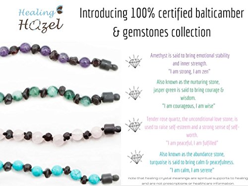 -. Binding : Baby Product -. Brand : Healing Hazel -. EAN : 0859722001693 -. Feature : Handmade with 100% certified Baltic amber / Must be in contact with the skin / May be in contact with plain water, however it is preferable to remove it before bathing or swimming to increase its lifespan / This product has a safety release and is accredited by the Consumer Product Safety Commission / You should be able to run two fingers along your baby's neck under the necklace -. IsAdultProduct : 0 -. Label : Healing Hazel -. Manufacturer : Healing Hazel -. ProductGroup : Baby Product -. ProductTypeName : BABY_PRODUCT -. Publisher : Healing Hazel -. Size : 10.5 inches -. Studio : Healing Hazel -. Title : 100% Certified Balticamber Pop Clasp Baby Necklace with Gemstones, Tender Rose Quartz, 10 1/2'' -. UPC : 859722001693