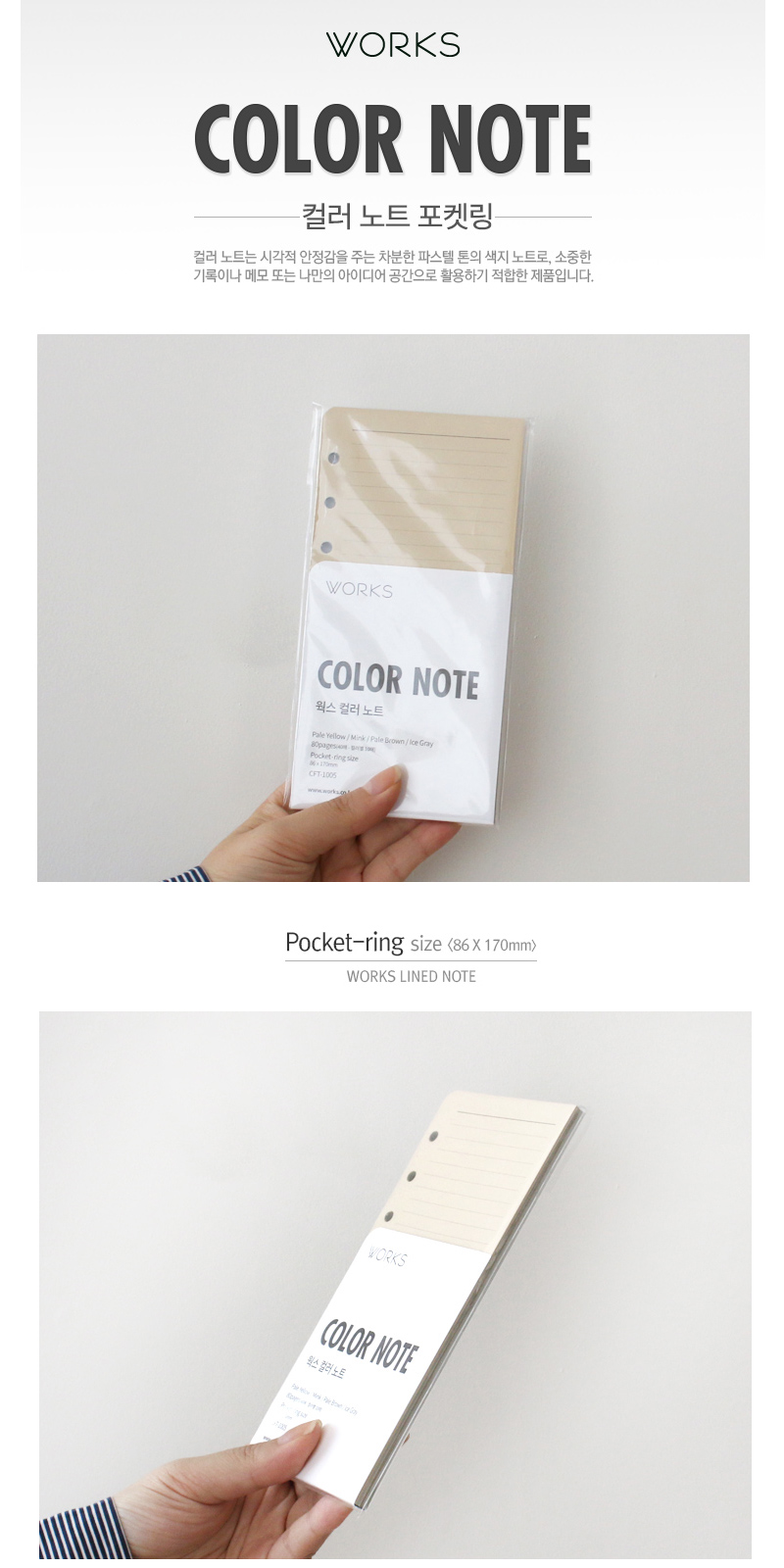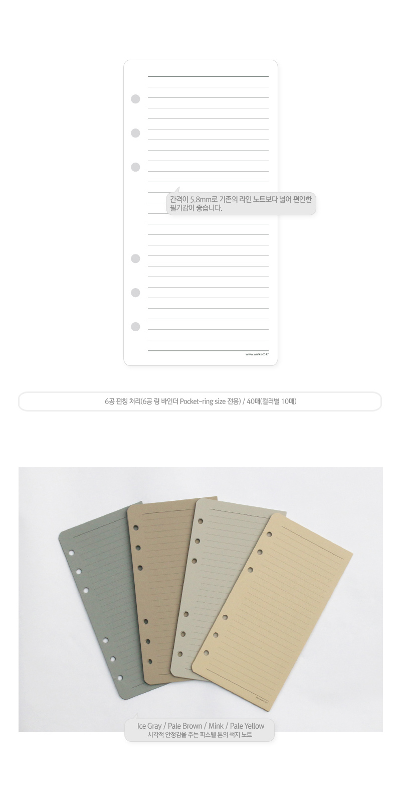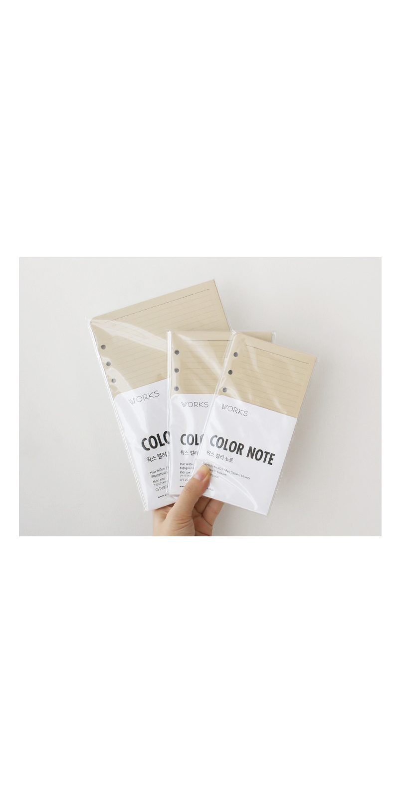 컬러 노트는 시각적 안정감을 주는 차분한 파스텔 톤의 색지노트로, Pale Yellow, Pale Brown, Mink, Ice Gray 등 4가지 컬러의 노트가 각 10매씩 총 40매로 구성된 솔루션 제품입니다.
