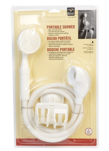 -. Feature : Slips over the faucet to create an instant shower / Lets you take showers in older style tubs / White vinyl hose and shower head / Wall bracket attaches to wall with heavy duty suction cup / Portable so you can take it anywhere