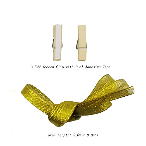 MATERIAL: Plastic card in gold glitter finished. Wooden clips with double-coating tape. 3M ribbon filled in gold glitter powder