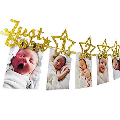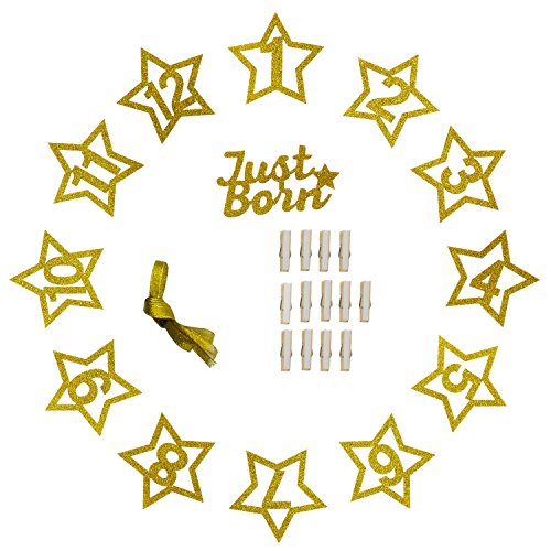 LOVELY DESIGN: Glitter monthly photo banner in glitter star design, come with 13pcs wooden clip