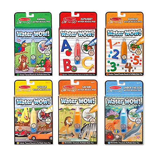 These six no-mess paint-with-water coloring books by Melissa & Doug will make kids three and older say, "Wow!" every time they reveal hidden pictures with a stroke of the water pen! Each Water Wow! Color-Reveal Pad (Animals, Alphabet, Numbers, Vehicles, Safari, Under the Sea) includes four reusable spiral-bound pages and a refillable water pen. Color, then let the page dry to erase the pictures and fill it in again and again. The chunky-sized water pen is easy for kids to hold and stores neatly right in the front cover, so Water Wow! books make an ideal travel activity!.Feature