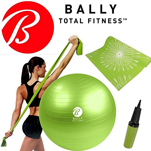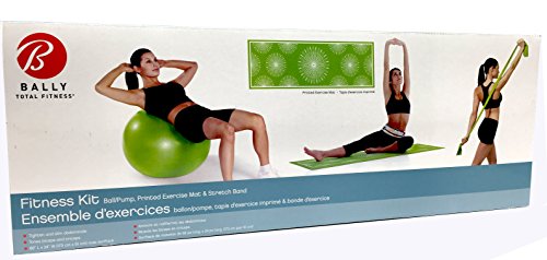 Bally fitness kit is a one-stop, convenient purchase that one needs to keep the body in shape using the anti-burst resistant ball, the lightweight printed mat and the medium stretch band The fitness kit has a 65cm fitness ball used to tone thighs, quads and buttocks, stretch upper and lower body, a stretch band used to tighten abdominals, develop shoulders and back and a 68" L X 24" W non-slip mat that provides traction and protection on hard surfaces.