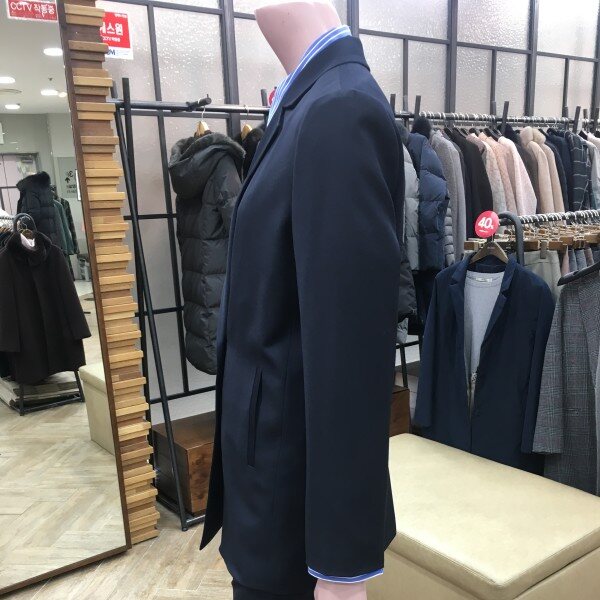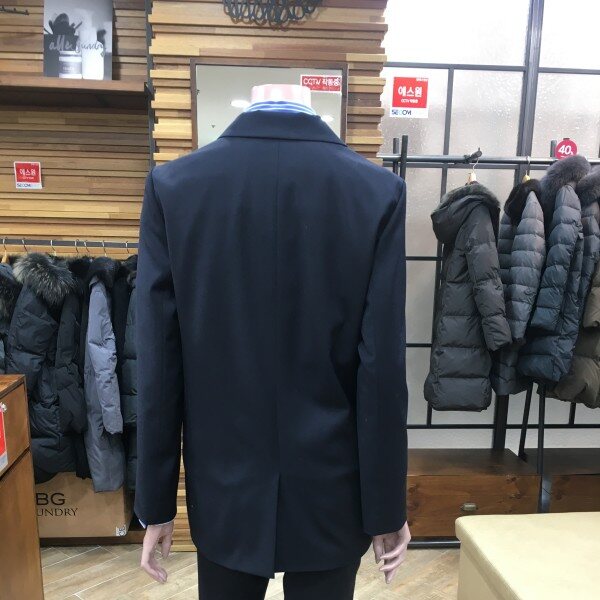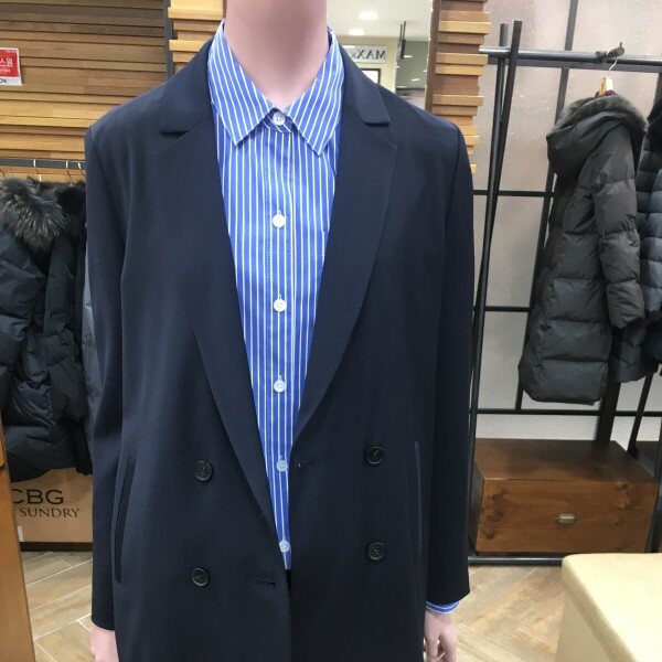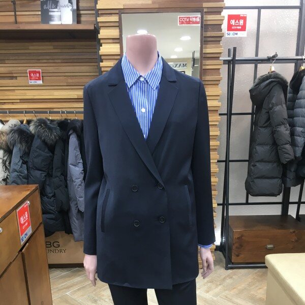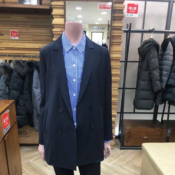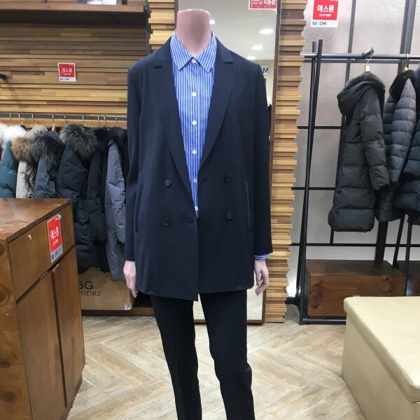 정장 벌 디자인의 더블형식 자켓입니다 반기장으로 힙을 덮는 스타일이며 허리선이 없이 박시한 디자인입니다