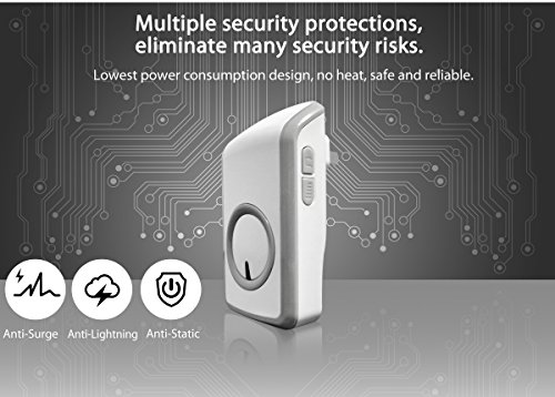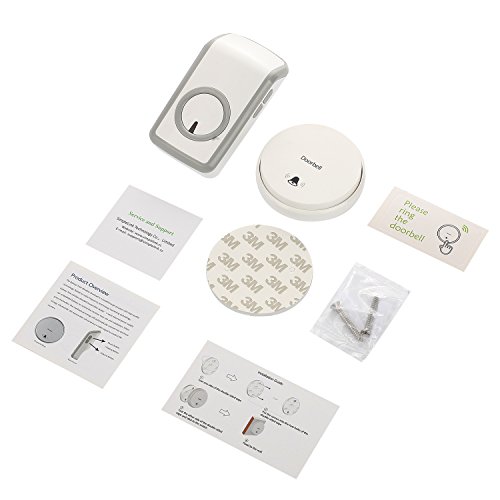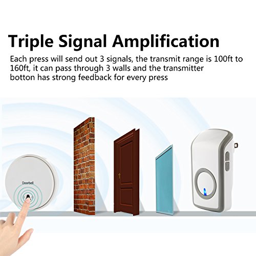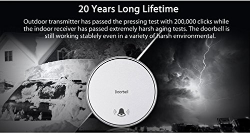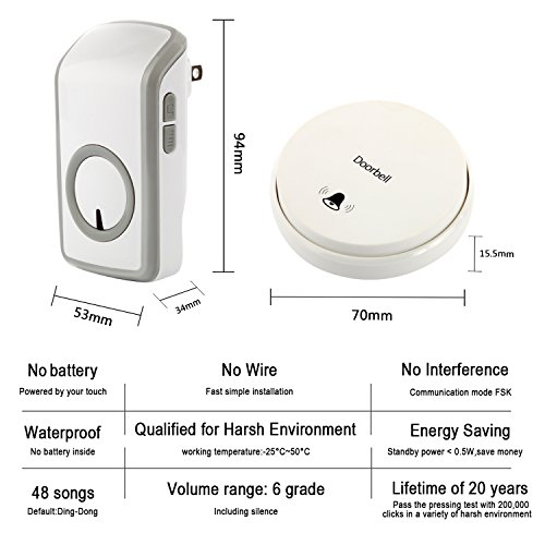 -. Feature : MAGIC SWITCH - Transmitter is used the unique PUSH-RF technology. When the button is pressed, it converts kinetic energy into an electrical signal to ring your wireless doorbells. So no more worrying your push button runs out of batteries and no more hassle in buying awkward weird batteries to run your push button. / IPX7 WATERPROOF TRANSMITTER - Kinetic self-powered switch required no batteries or external power connecting, it can be completely submerged underwater and endure harsh weather or downpour. / TRIPLE SIGNAL AMPLIFICATION - Base of RF wireless technology, the signal can penetrate 3 walls, the practical is range 100ft to 160ft / UNPARALLELED USER EXPERIENCE - Very easy to install, once the doorbell is set up, it's hassal free, you don't need to replace battery, you don't have to worry anything about it. And it also have 48 Melodies to choose and 6 level of ring volume. / 20 YEARS OF SEVICE TIME - Made of CE/Rohs certificated material, The switch has passed the pressing test within 200,000 clicks, it's 20 years of normal ues, and 10 times durable than ordinary switch.