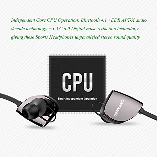 -. Feature : ♫ SENYANG Bluetooth headphones feature Bluetooth 4.1 + EDR APT-X audio decode technology, giving these wireless earbuds unparalleled stereo sound quality. CVC 6.0 Digital noise reduction technology, intelligently filter ambient noise, enable clearer sound during calls and while listening to music; You've truly never heard music sound so good from sport headphones! / ♫ Longer listening with our Bluetooth headset, running & workouts can go for longer to the beat! The polymer 80mAh battery in the Bluetooth headphones wireless device provides 6 hours of Talking time, 5 hours of Music time ,200 hours of standby time . Much more than other sports headphones! / ♫ Our wireless headphones pair with devices up to 10 meters away, and the Bluetooth headset has mic functionality, so you don't have to stop working out to answer calls. The volume, sound, song selection and telephone controls are all right on the wireless Bluetooth earbuds, making these the most convenient Bluetooth earbuds for running, sports, lifting weights & more! / ♫ Supports pair with 2 different devices simultaneously and allows to automatically connecting after paired successfully for the first time. This gives you double the possibilities for answering calls and streaming music to your workout headphones, all while enjoying premium Bluetooth earbuds wireless sound quality. / ♫ You can get a Running Belt Waist Pack as a gift, it fits Apple iPhone 6 Plus/6S Plus (5.5 inch), Samsung Galaxy S6 Edge Plus/Note 3/4/5 S7 Edge and also fits iPhone SE / 5 / 5S / 5C / 4 / 4S / Galaxy S3 / S4 with Any Cases, but Little Loose. It is best choise for Running, Sports, Workout, Exercise, Gym, Jogging, Bicycle, Women, Men, Girls, Boys, Guys, Runner, Walker.
