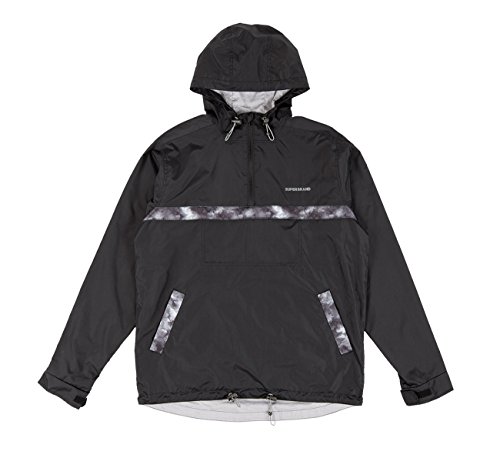 Binding : Apparel Product Description The Burnside WindbreakerJacket in Black and Cloud. Custom printed pullover windbreaker featuring our burnside surfboard artwork.Features a 1/4 zip front closure and a front chest zip pouch pocket and side hand pockets. Fully lined with cotton chambray Adjustablehood and waist bungee closure Adjustable cuff velcrotabs 100%polyester 0