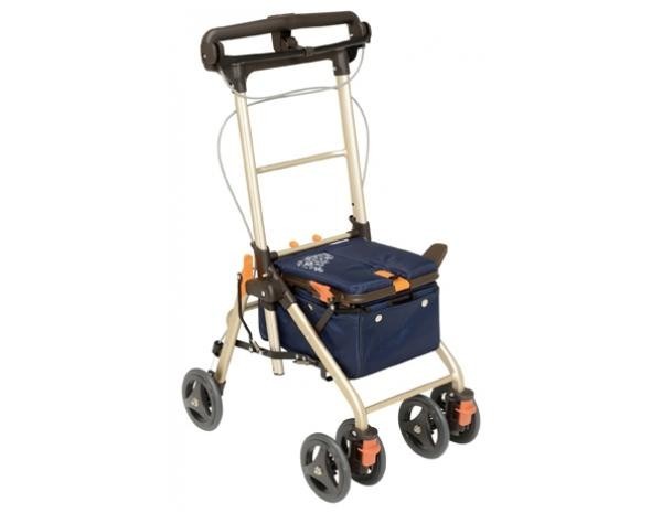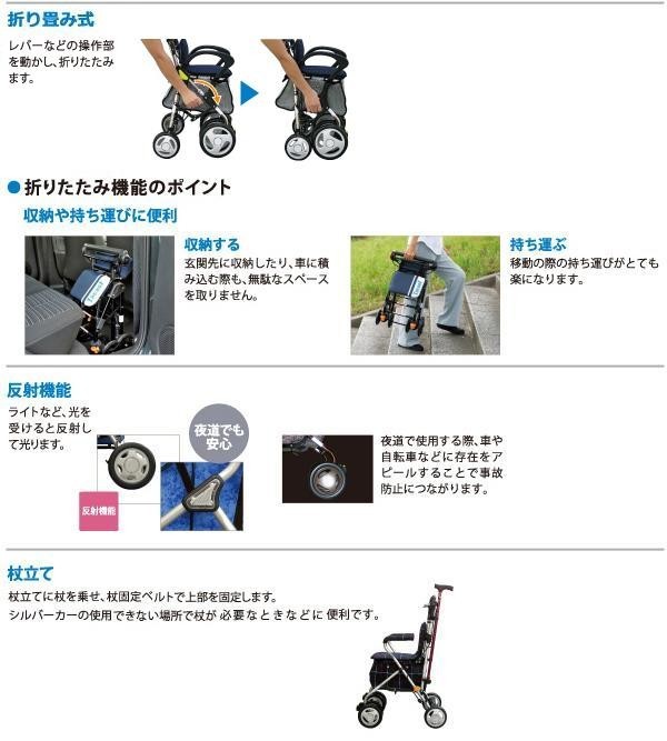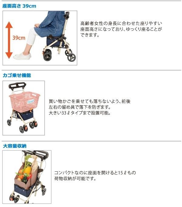 | 小回りがきくコンパクトさと、持ち運びしやすい軽量さが特徴のシルバーカーです。歩行で疲れた時は座って休むことができます。コンパクトながら15Lもの荷物が収納できるので、お散歩だけでなくお買い物にも!! |