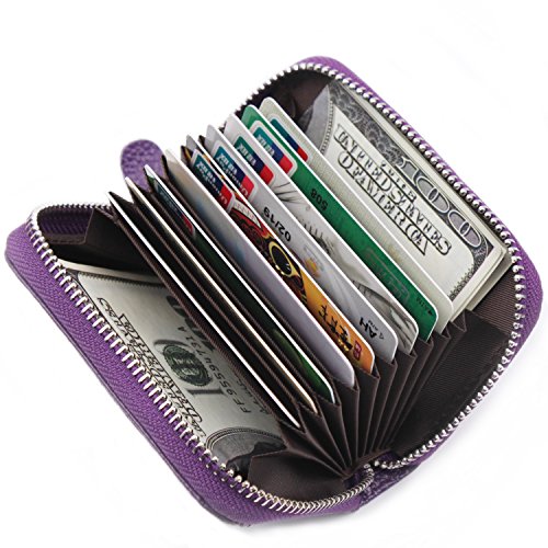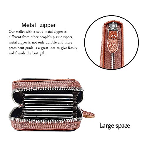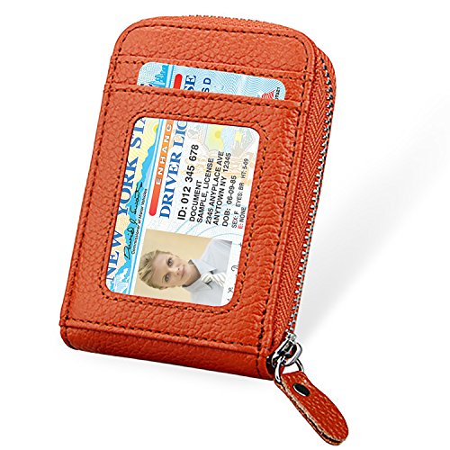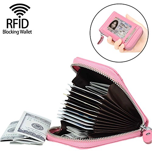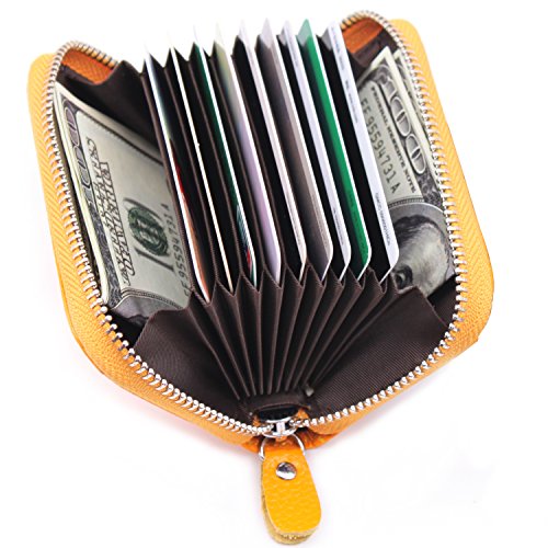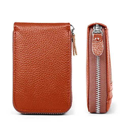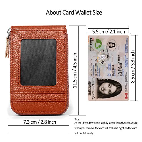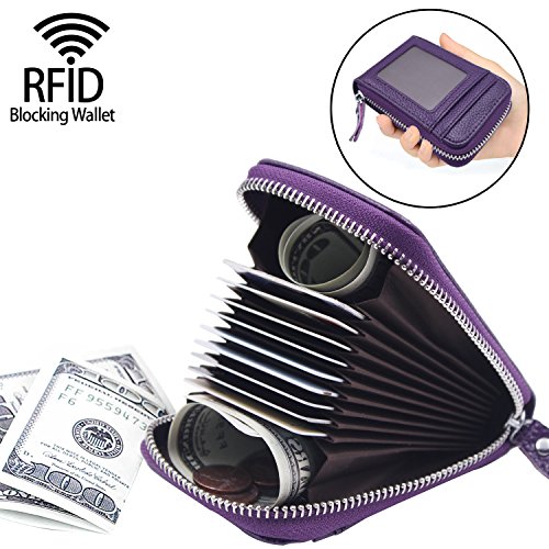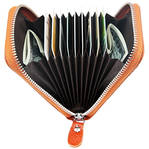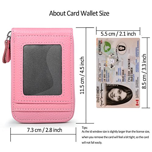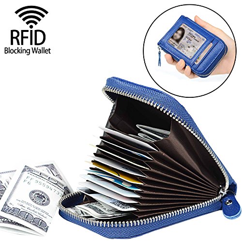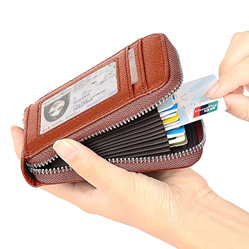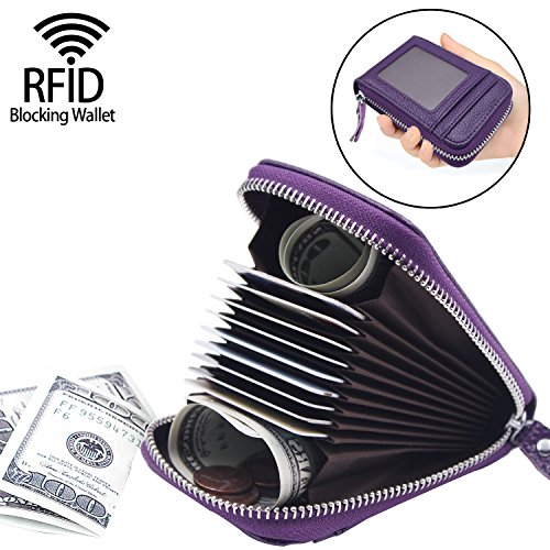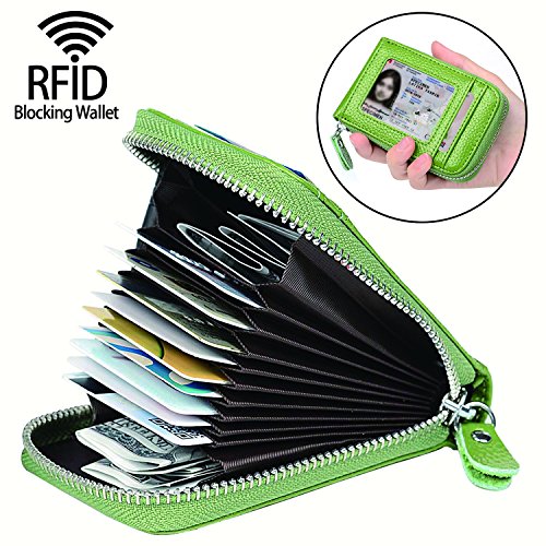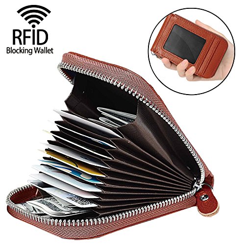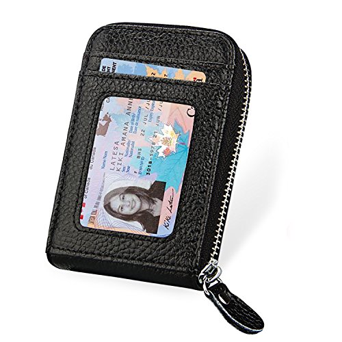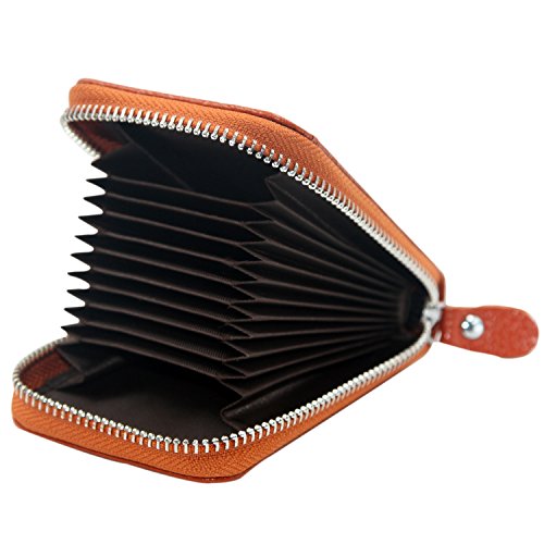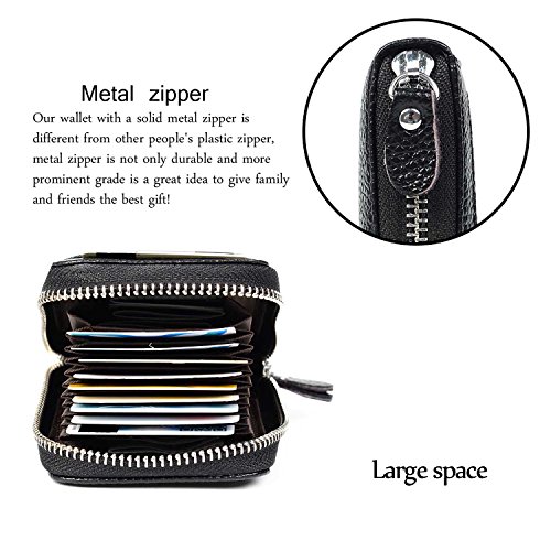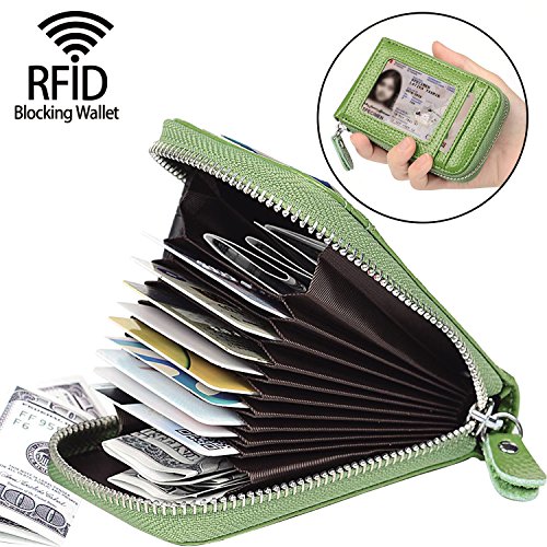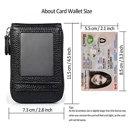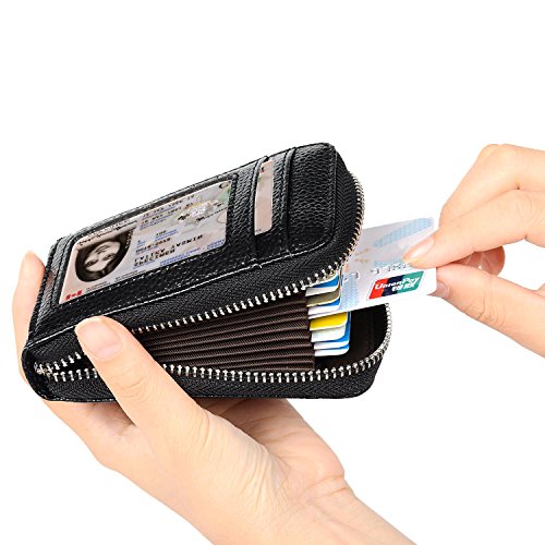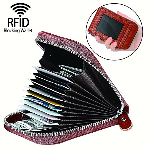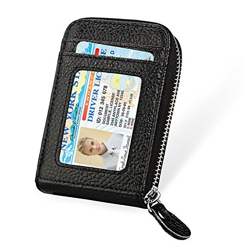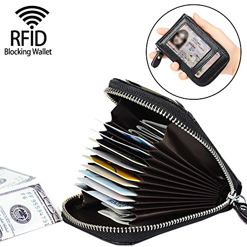| RFID Blocking Genuine Leather Zip Around Accordion Credit Card Holder Wallet with ID Card Window |