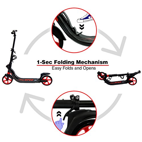 -. Feature : Unique 1-Sec Folding Mechanism! This adult kick scooter can be folded or open in one step in a second, plus the included Shoulder strap, it is the perfect solution for quick storage and convenient transportation. / Front & Rear Suspension System, Over-sized 200mm durable PU rubber wheels , precision ABEC-9 bearings, creating an incredibly smooth glide on most terrains, allows the commute and trips around the town to be smooth and enjoyable. / 3 level Height Adjustable Telescoping T Handlebars, High density durable aluminum frame supports up to 220 Lbs. Weight only 13.5 lbs, Dimensions: 35.5" x 15" x 35" when opened. / Features an easy to access large aluminum reinforced brake pedal, you could easily apply a powerful yet safe way to stop. / Includes a bottle holder to quench your thirst on those long commute coasts.Note:Light Assembly and Adjustment Required.