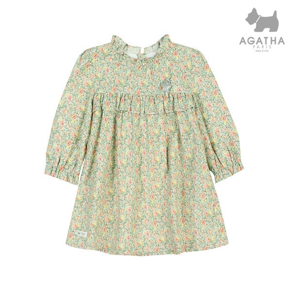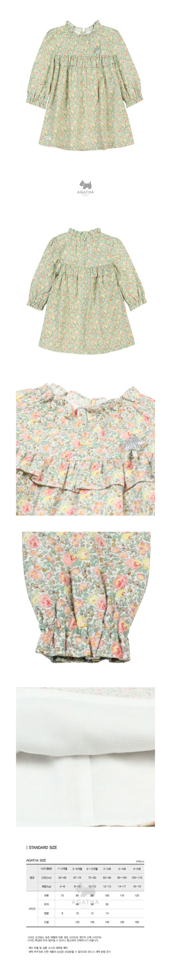 플라워 패턴의 기모 원단을 사용한 원피스로 카라와 가슴 프릴 장식으로 러블리한 느낌을 주는 아이템입니다.
