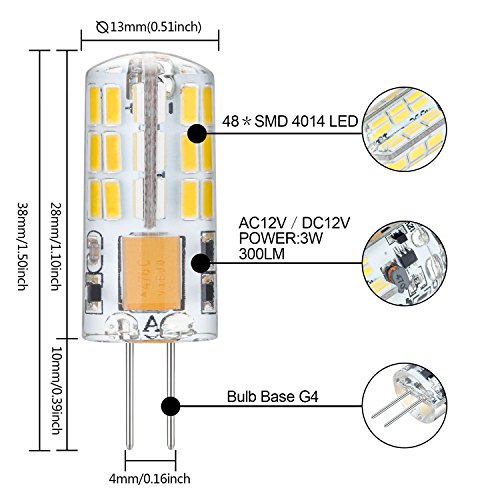 - ☞ Excellent Performance→Not Dimmable LED Bulb, G4 LED Bulb Sealed Hermetically with Clear Silica Gel, G4 Bi-Pin Base, Warm White 3000K, 300 Lumens, 48pcs 4014SMD Inside, Light Pattern Same as Halogen Bulbs