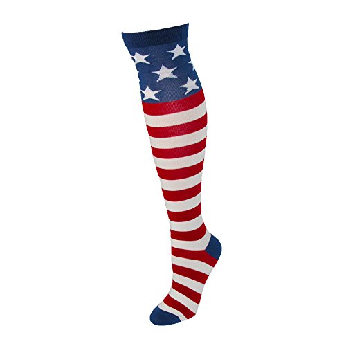 Studio : K. Bell Publisher : K. Bell Binding : Apparel Product Description This American flag knee high is a perfect patriotic addition to any holiday or every day outfit. The knee design measures 14 inches high and has a one inch elastic band to ensure sock stays in place. A fun American flag print has red and white stripes with blue back ground. 0