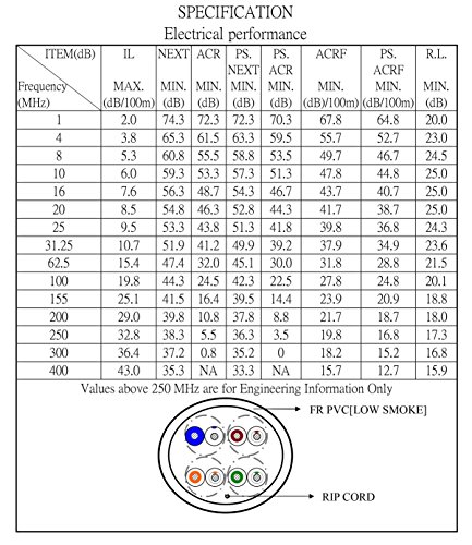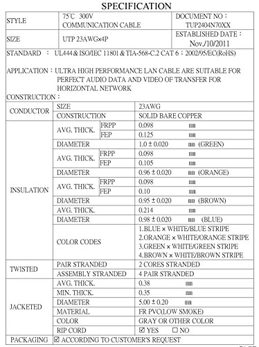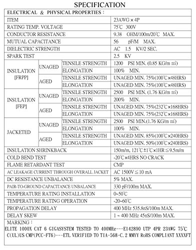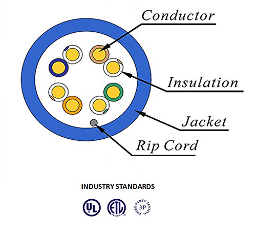 Designed with headroom for tomorrow's emerging high speed LAN technologies, these Cat6 bulk (LAN) cables are perfect for Gigabit Ethernet, ATM and Broadband Video. CAT 6 plenum Category 6 (ANSI/TIE/EIA-568-B is a cable standard for Gigabig Ethernet and other network protocols that is backward compatible with the Category 5/5e and Category 3 cable standards. Cat-6 features more stringent specifications for crosstalk and system noise. The cable standard provides performance of up to 250 MHz and is suitable for 10BASE-T / 100BASE-TX and 1000BASE-T (Gigabit Ethernet). It is expected to suit the 10GBASE-T (10Gigabit Ethernet) standard, although with limitations on length if unshielded Cat 6 plenum cable is used. The cable contains four twisted copper wire pairs, just like earlier copper cable standards. Although CAT-6 is sometimes made with 23 gauge wire, this is not a requirement; the ANSI/TIA-568-B.2-1 specification states the cable may be made with 22 to 24 AWG gauge wire, so long as the cable meets the specified testing standards. When used as a patch cable, CAT-6 is normally terminated in 8P8C modular connectors, often incorrectly referred to as ôRJ-45ö electrical connectors. Some CAT-6 cables are too large and may be difficult to attach to 8P8C connectors without a special modular piece and are technically not standard compliant. If components of the various cable standards are intermixed, the performance of the signal path will be limited to that of the lowest category. As with all cables defined by TIA/EIA-568-B, the maximum allowed length of a Cat-6 plenum horizontal cable is 90 meters (295 feet). A complete channel (horizontal cable plus cords on either end) is allowed to be up to 100 meters in length, depending upon the ratio of cord length: horizontal cable length.Warranty