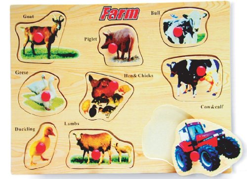 Studio : Puzzled Inc. Publisher : Puzzled Inc. Binding : Toy Product Description This 9-piece colorful Farm sturdy wooden pegs puzzle is a fun educational treat for your young puzzler! Wooden construction makes for durable, repeated play. Each piece has a small peg placed in it to assist little ones in lifting the pieces and developing their motor skills through play. For ages 3 and up. 0