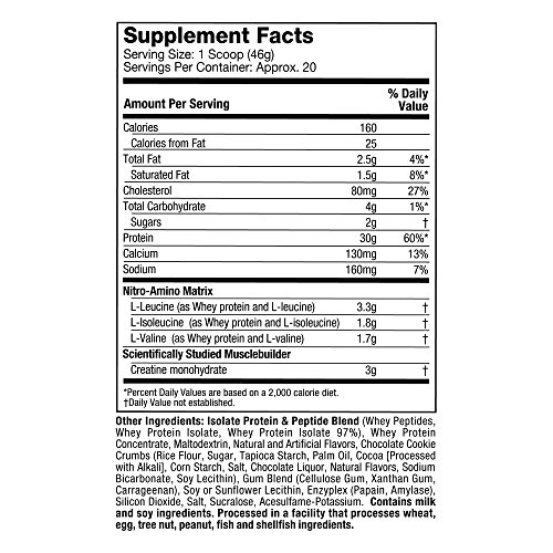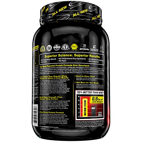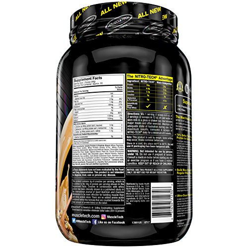 ReleaseDate : 2017-12-01 Studio : Iovate Health Sciences Incorporated Publisher : Iovate Health Sciences Incorporated Binding : Health and Beauty Product Description Nitro Tech is scientifically engineered whey protein powder designed for anyone looking to build more muscle, improve their strength and enhance overall performance. NitroTech from MuscleTech contains pure whey protein isolate and peptides as the primary source. Every scoop provides 30 grams of ultra-pure whey protein and 6.9 grams of Branched Chain Amino Acids (BCAAs) along with a strength-enhancing 3 gram dose of creatine. At MuscleTech we believe that you shouldn't have to sacrifice macronutrients for results. The result is a great-tasting formula that doesn't pack the extra sugar and carbs you'll see in other protein powders. Nitro Tech gives you more protein per scoop and a better overall macronutrient profile. 0