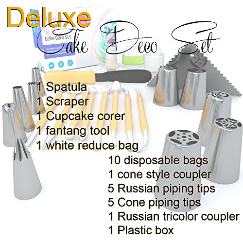 28 Pieces Cake Decorating Kit. Top-Grade Stainless Steel Bakery Supplies. Set of 5 Russian Piping Tips, 5 Regular Cone Tips, 1 Spatula, Scraper, Cupcake Corer, Fantang Tool, Disp. Bags, Reduce Bag