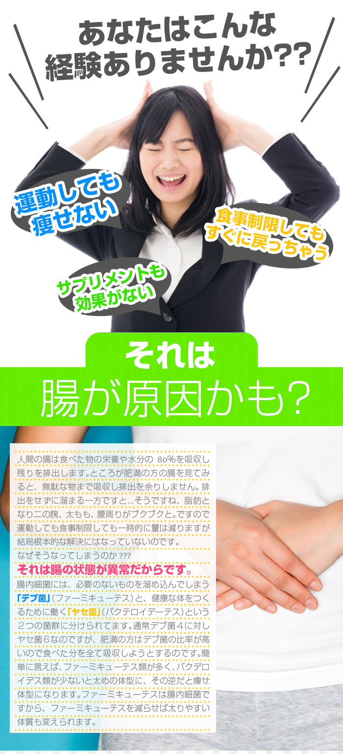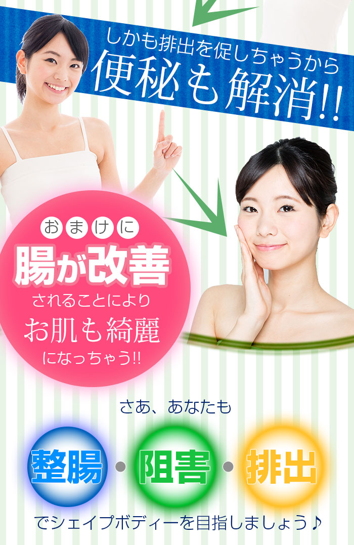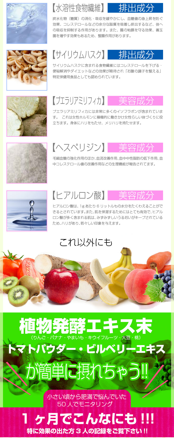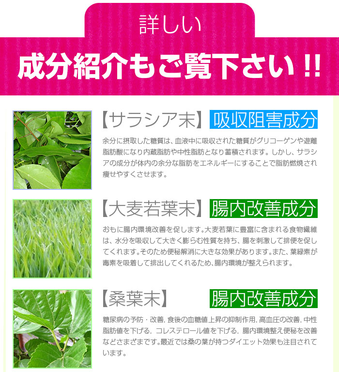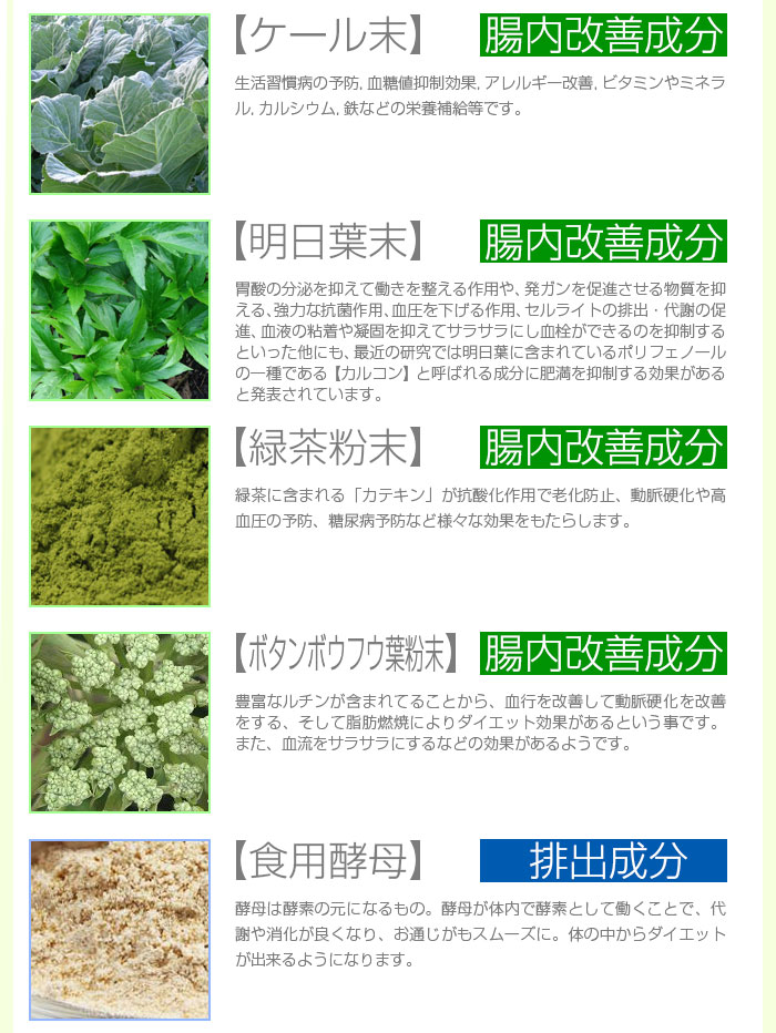 | 成分 | 水溶性食物繊維、マルトデキストリン、緑茶粉末、ドロマイト、大麦若葉、桑葉末、ケール末、明日葉末、食用酵母(マンガン、亜鉛、銅、クロム、モリブデン、セレン含有)、サラシア末、デキストリン、植物発酵エキス末(りんご・バナナ・やまいも・キウイフルーツ・大豆・桃を含む)、プエラリアミリフィカ末、穀物麹、長命草末(ボタンボウフウ)、ビルベリーエキス、トマトパウダー(リコピン含有)、穀物発酵エキス(小麦を含む)/トレハロース、サイリウムハスク、微粒酸化ケイ素、ヒアルロン酸、β-カロテン、へスぺリジン |