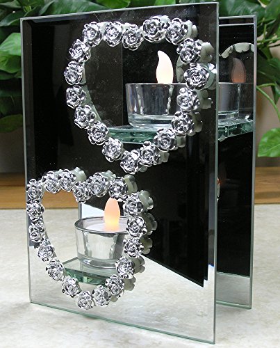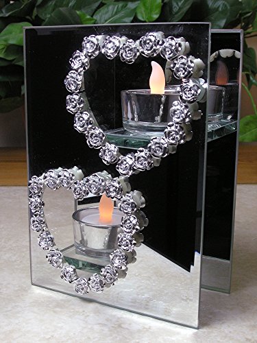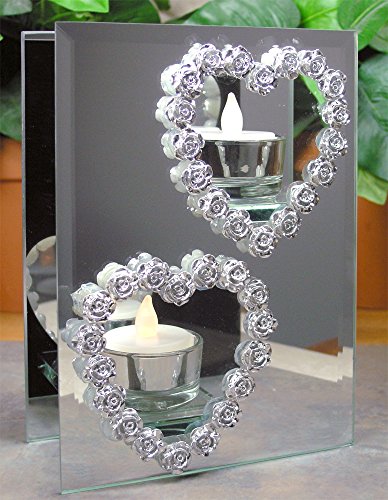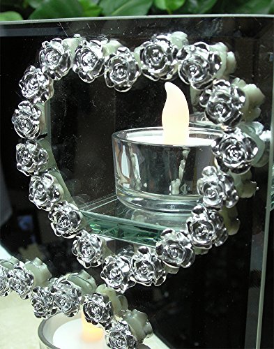 Valentine's Day Decorations - Silver Heart Mirrored Candle Holder - Heart Candle Holder - 2 Flameless Tea Light Candles Included