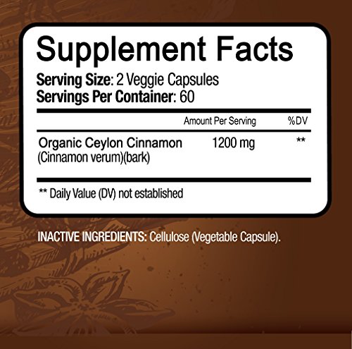 -. Feature : ☀☀☀120 CAPSULES☀☀☀ BEST VALUE AVAILABLE: Each bottle contains 120 Vegetarian Capsules for a full 60 day supply. Each Serving of 2 Capsules provides 1200mg of Ceylon Cinnamon. Your purchase is backed by our 100% Money Back Guarantee / HIGHEST POTENCY CEYLON CINNAMON: Our Ceylon Cinnamon, Made with Natural Ingredients, is a powerful antioxidant and is free of GMO Ingredients. It supports healthy blood sugar levels, promotes heart health, helps with weight management, helps with joint pain, and serves as a power anti-inflammatory supplement / SOURCED DIRECTLY FROM CEYLON (SRI LANKA) - Our Cinnamon Ingredients are sourced directly from Ceylon (Sri Lanka) hence the name Ceylon Cinnamon, which is also known as "true cinnamon" or "Cinnamon Verum Bark." The Ceylon Cinnamon is the highest quality available and is in very high demand, and as such is more expensive than the common Cassia Cinnamon / SAFER THAN CASSIA CINNAMON: Always look for CEYLON Cinnamon when shopping for Cinnamon Supplements; this is the most effective and safest type of Cinnamon Supplement. The alternative Cassia Cinnamon, which is also commonly known as Common Cinnamon, may be toxic when taken as a supplement or used in large doses over prolonged periods of time. / 100% SATISFACTION GUARANTEE: As with all our products, our Ceylon Cinnamon is backed by our 100% money back guarantee. Feel Healthier and Stronger, or your money back. No Questions Asked!