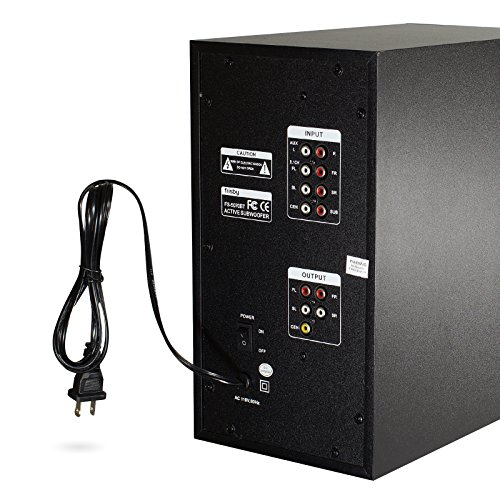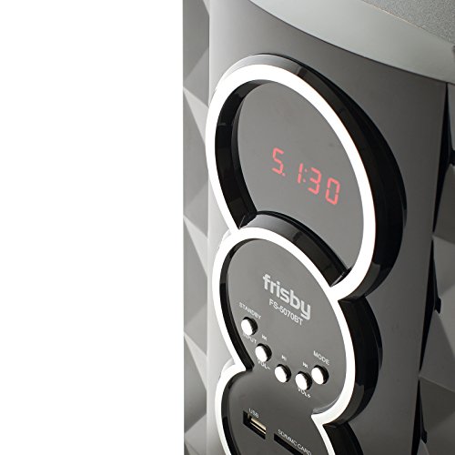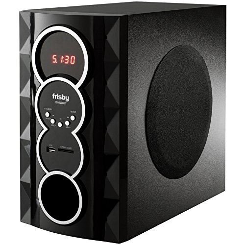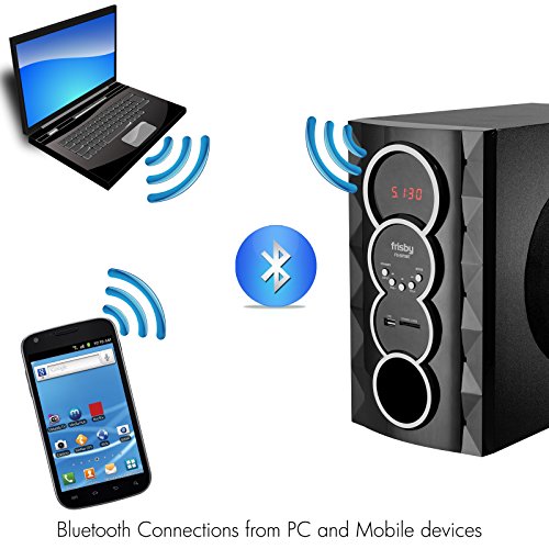 Frisby FS-5070BT Bluetooth 5.1 Speakers provides clear sound from all satellite speakers and woofer from up to 30 feet away. You can sync any Bluetooth enabled device; your phone, tablet, media player or even your computer. The subwoofer features an LCD screen that makes it easy to see which track you're playing or adjust EQ level or volume. Frisby FS-5070BT supports Bluetooth 5.1 technology for streaming audio wireless from devices that are Bluetooth-enabled. For other non-Bluetooth devices, there is a 3.5mm auxiliary input ports. Additional conveniences include an LCD display and included remote control. You've got full power to fill your room with big, balanced sound. Both speakers and the subwoofer are magnetically shielded to provide the protection against image distortion from external electronic sources. Compatible with all PC models, Labtops, smartphones and all mp3 players, IPOD, discmans, walkmans equipped w/ headphone jack. The system is complete, comes with all necessary cables. The included remote control has controls for bass and treble EQ, volume, play/pause, previous/next track, Bluetooth sync and power. The speaker also has an LCD display and volume/sync buttons. Contents: Subwoofer/Amplifier, Center Channel Speaker, 4 Satellite Speakers, Remote Control, Manual, 3 RCA cable, 1 Audio cable...SUBWOOFER Driver Size 5.25 inches, 50 Watt RMS, Dimensions Width: 6.9 " Depth: 12" Height: 13", SATELLITES Driver Size 3 inches, Dimensions Width: 4.6" Depth: 4quot; Height: 8.9"... WARRANTY : 1 year warranty exchanges for factory defects.Feature