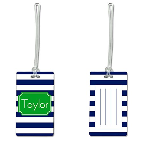 Product Description Your luggage or any bag will stand out with this great looking personalized luggage tag. The luggage tag features a navy stripes design with a kelly green text box and a name in the middle. Simply select Customize Now and you add the name you would like in the bag tag. The luggage tag measures 2.5" X 4.25 and a 6 inch clear plastic loop for easy attachment is included. The bag tag is made of a hard fiberglass reinforced plastic. Your bag will definitely stand out with this great looking luggage tag. The back of the luggage tag features an outline of the same pattern as the front and then 4 lines for you to write any information you would like. Note, the personalization is only the name on the front. The 4 lines on the back are blank and designed for you to write the information you would like. 0