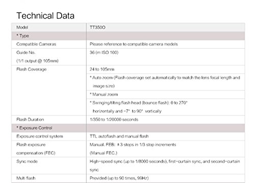 GN36 (m ISO 100,@105mm), 22 steps of power output(1/1-1/128), Support TTL/M/Multi/S1/S2 modes, 24-105mm auto/manual zooming, Approx. 0.1-2.2s recycle time, 210 full power flashes(using 2500mA Ni-MH batteries)