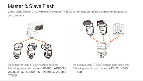 As a mater unit, TT350O can control the AD600, AD600M, AD360II-C AD360II-N, AD200, V850II, TT600 speedlite