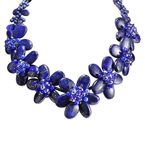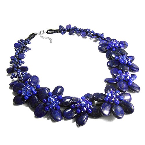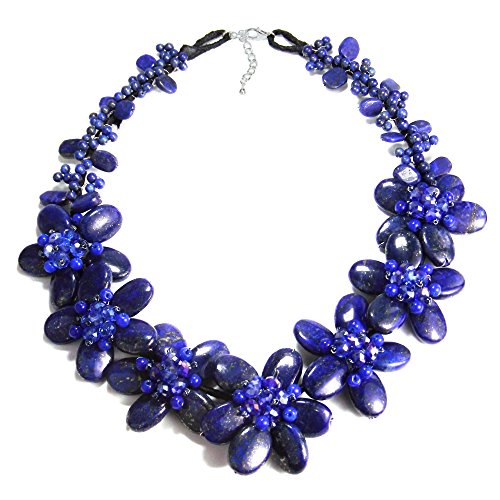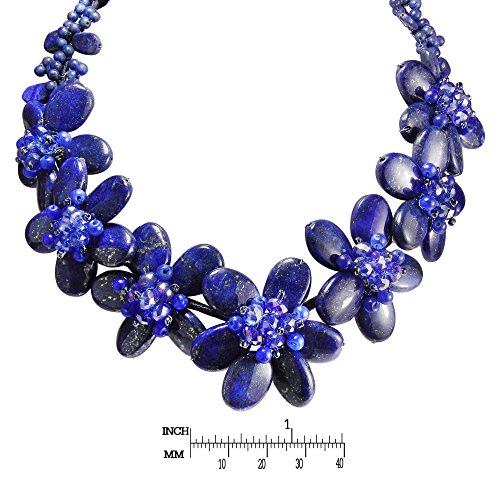 Alluring simulated blue lapis-lazuli, blue chalcedony, and fashion crystals create an elegant aura of beauty in this magnificent necklace. Crafted by hand, this feminine necklace showcases a floral design. PLEASE NOTE: The handcrafted nature of this product will produce minor differences in design, sizing and weight. Variations will occur from piece to piece, measurements may vary slightly.Includes an original AERAVIDA organza jewelry pouch (comes in various colors), also handmade by our Artisans. Perfect for gift giving to someone special or keep for yourself!
