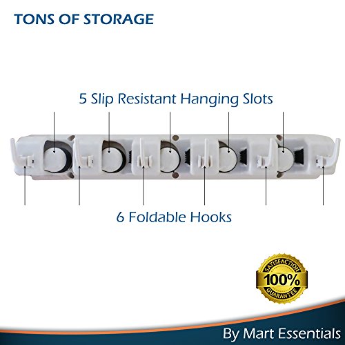 Broom and Mop Wall Mount Storage Holder Organizer By Mart Essentials - 5 Non Slip Rubber Adjustable Slots With Spring Controlled Balls 6 Folding Hooks For Mops Brooms Sports and Garage Tools