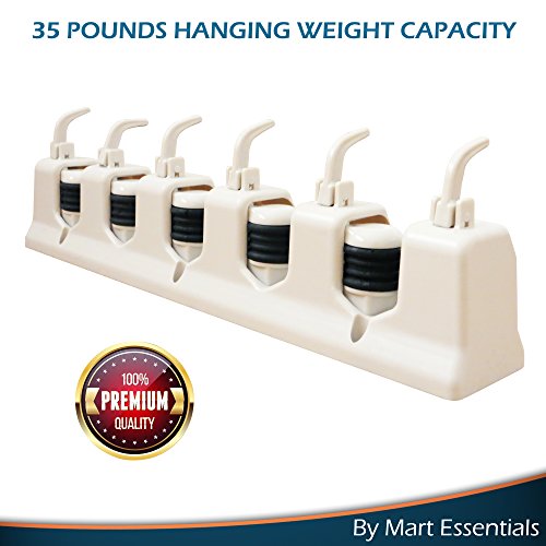 35 POUNDS HANGING WEIGHT CAPACITY: This top notch wall mount mop holder is ideal for organizing and storing your brooms, mops, sports equipment and handheld tools. Each slot features a 5 pound hanging weight capacity, allowing you to securely hang thins which weigh up to 35 pounds.